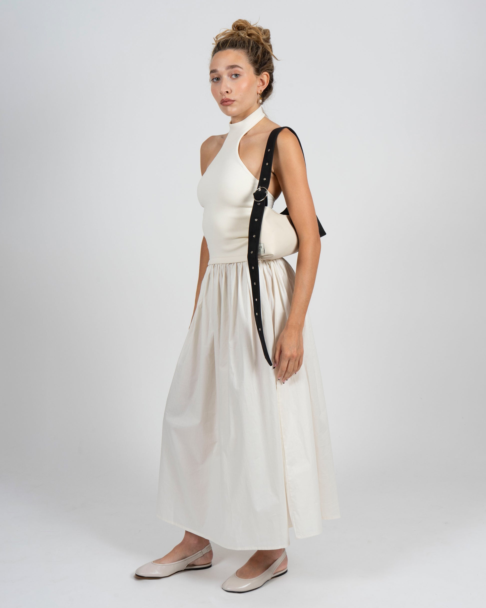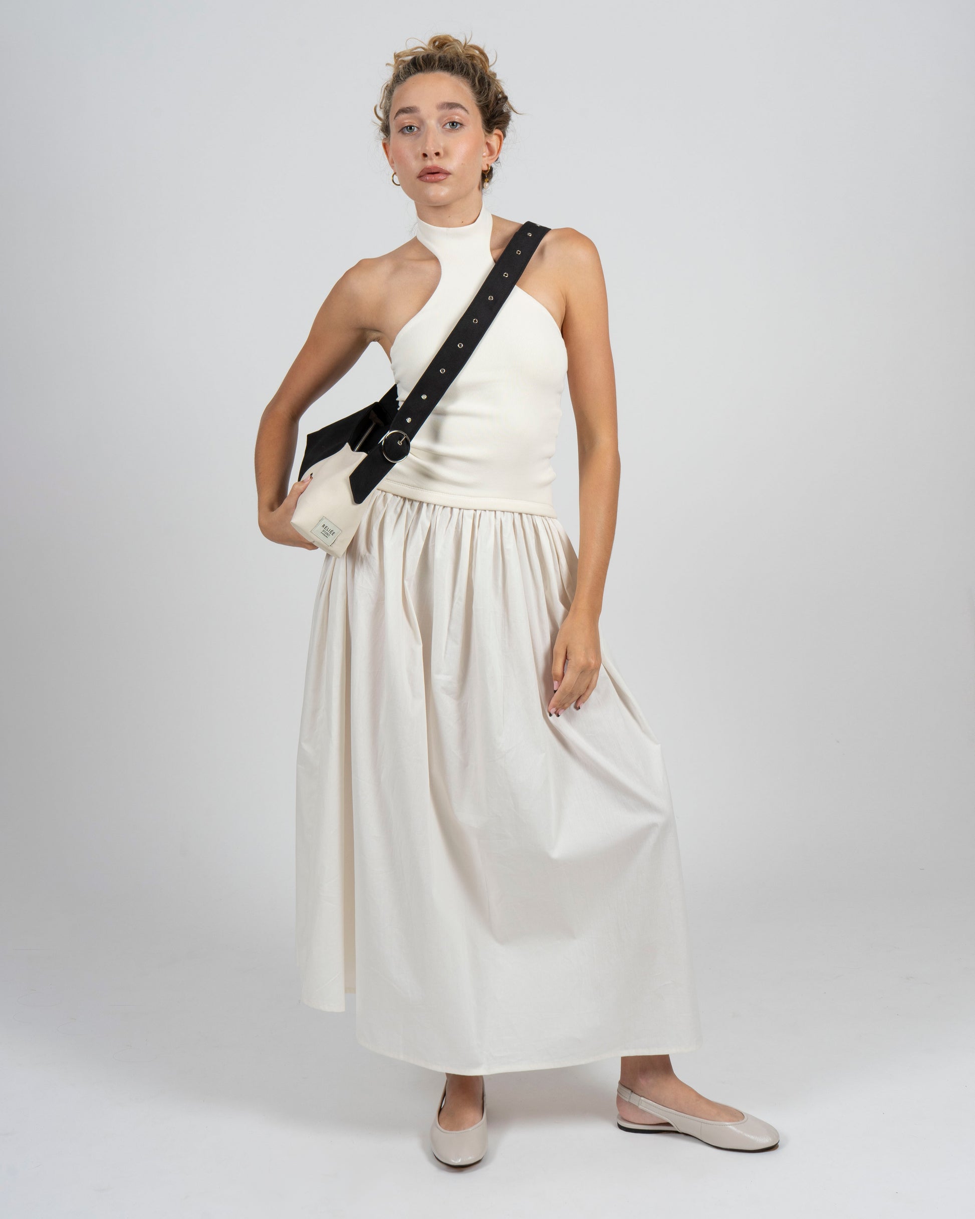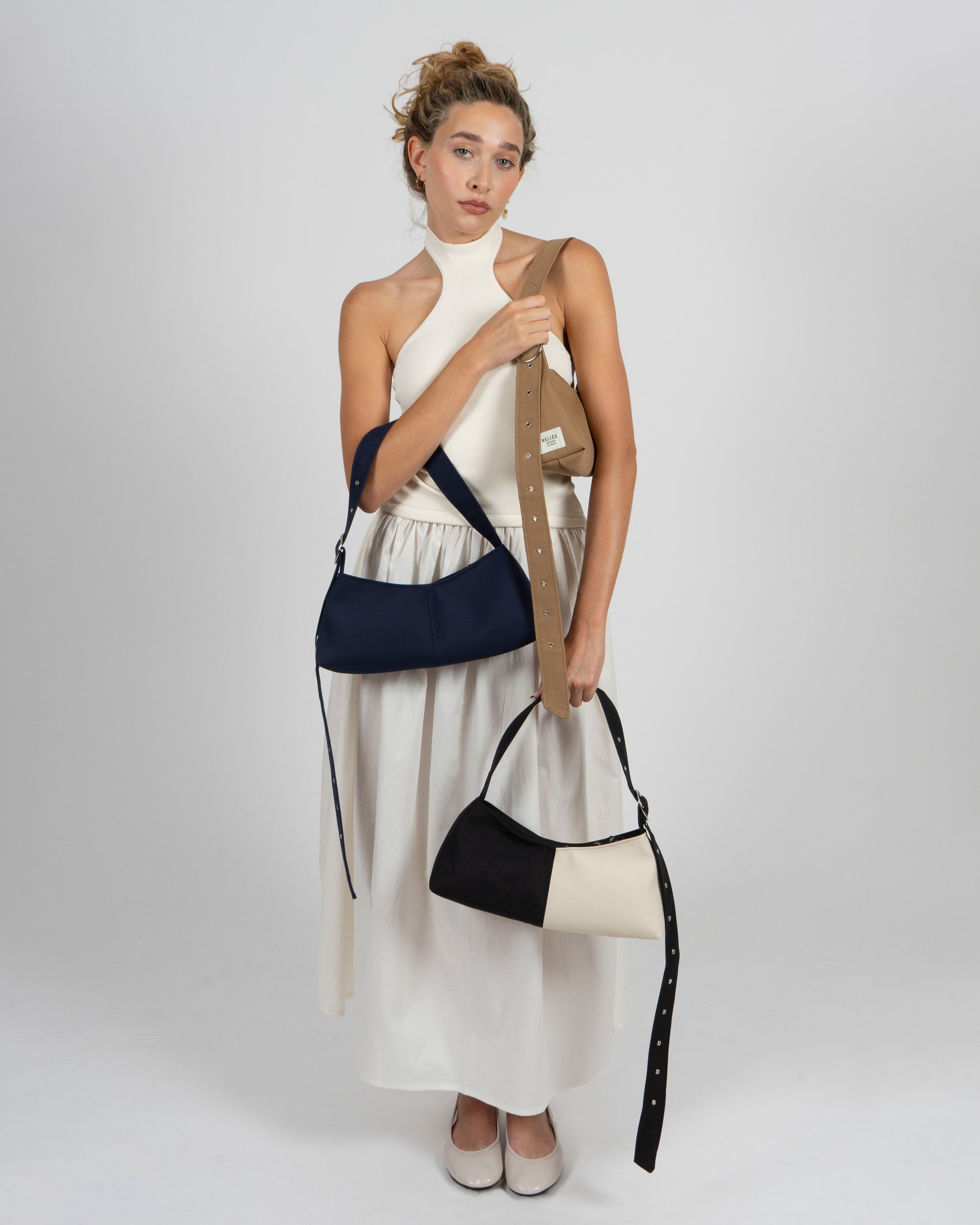 Gala, el bolso baguette con correa regulable y hebilla circular, ideal para usarlo al hombro o cruzado.