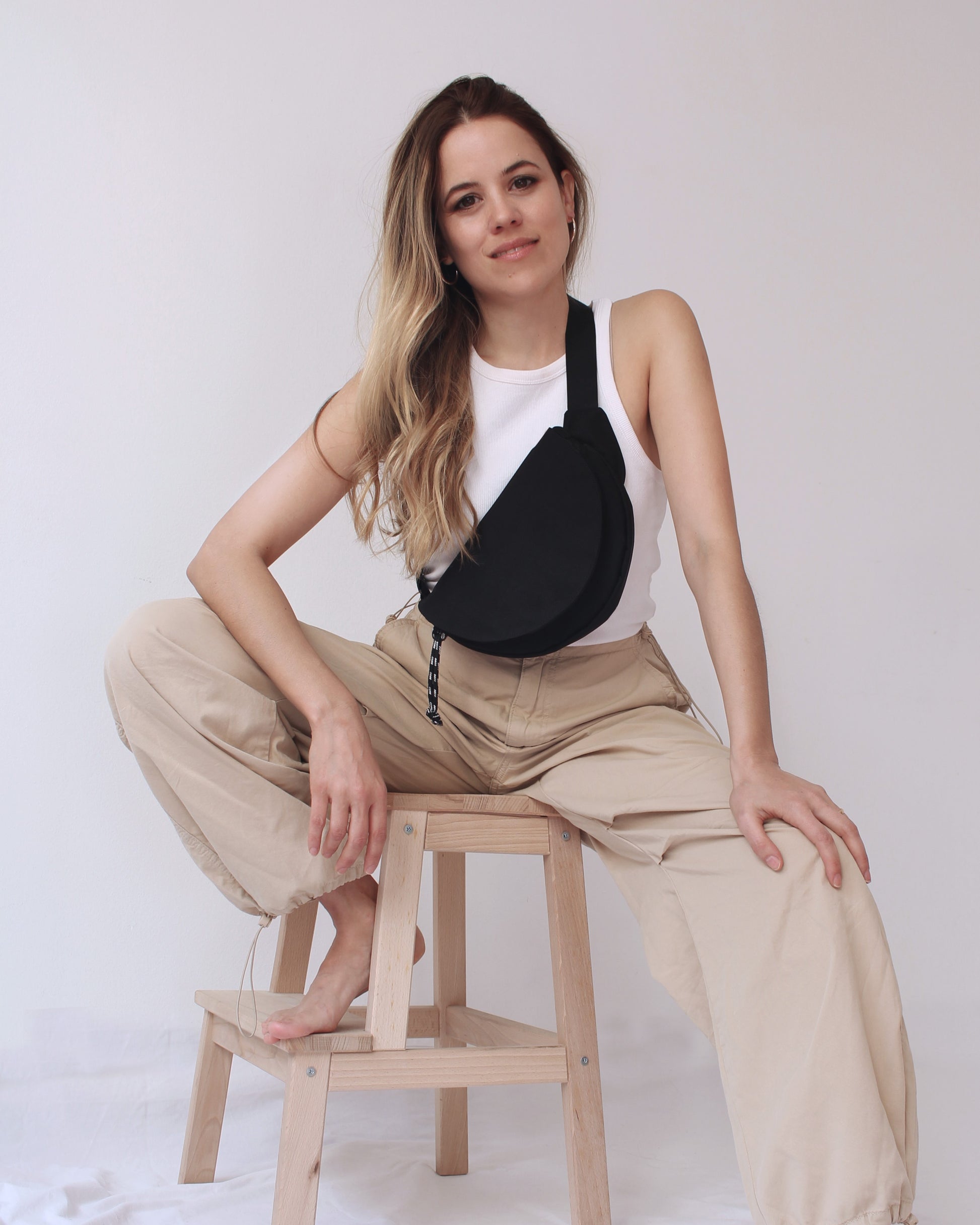 Mini Anna es la hermana pequeña de Anna, un bolso-banana, reciclado y súper seguro. Con esta versión mini, podrás llevar contigo todo lo que necesites en un tamaño compacto y cómodo, ideal para llevar lo mínimo y fundamental: billetera, celular y llaves.