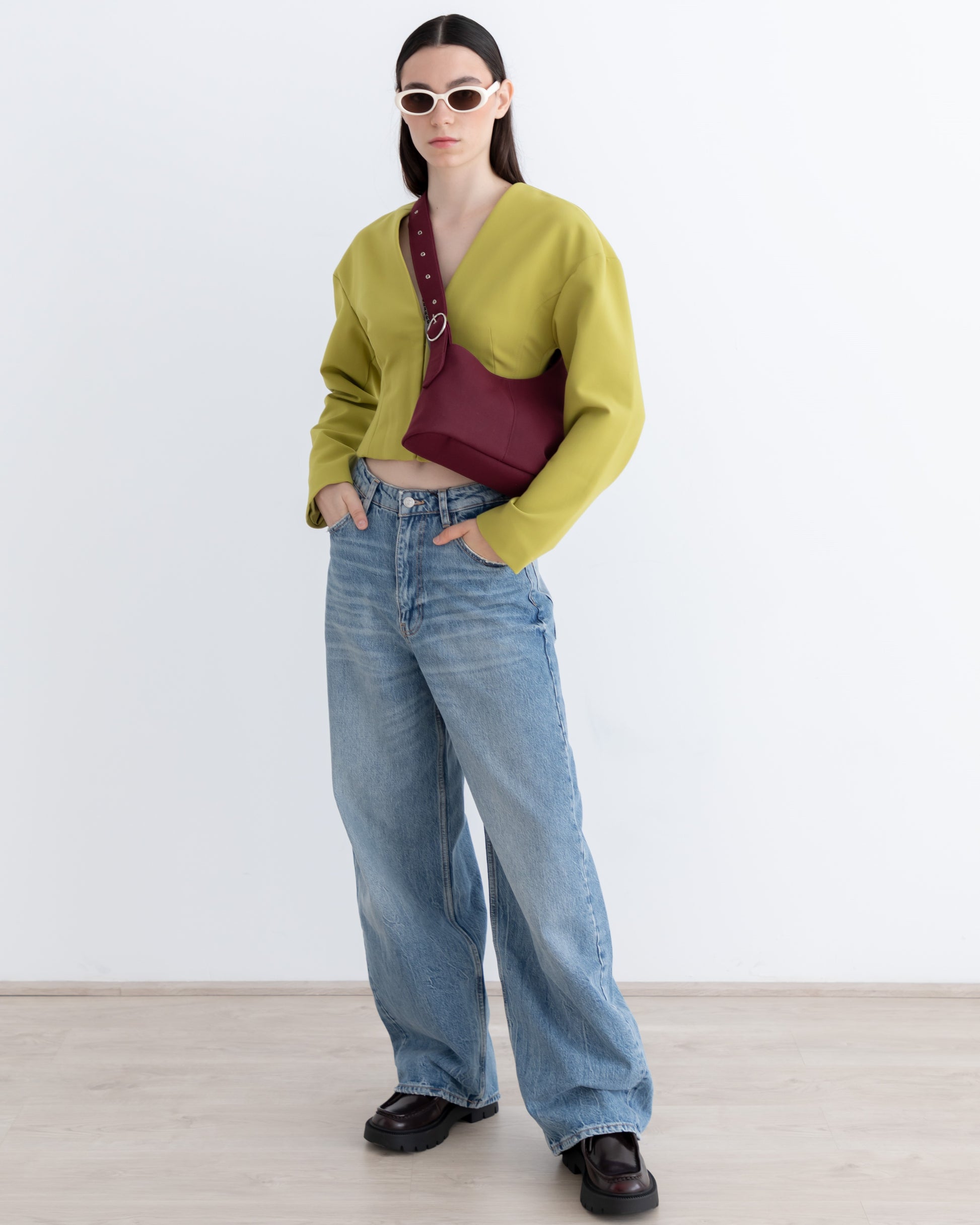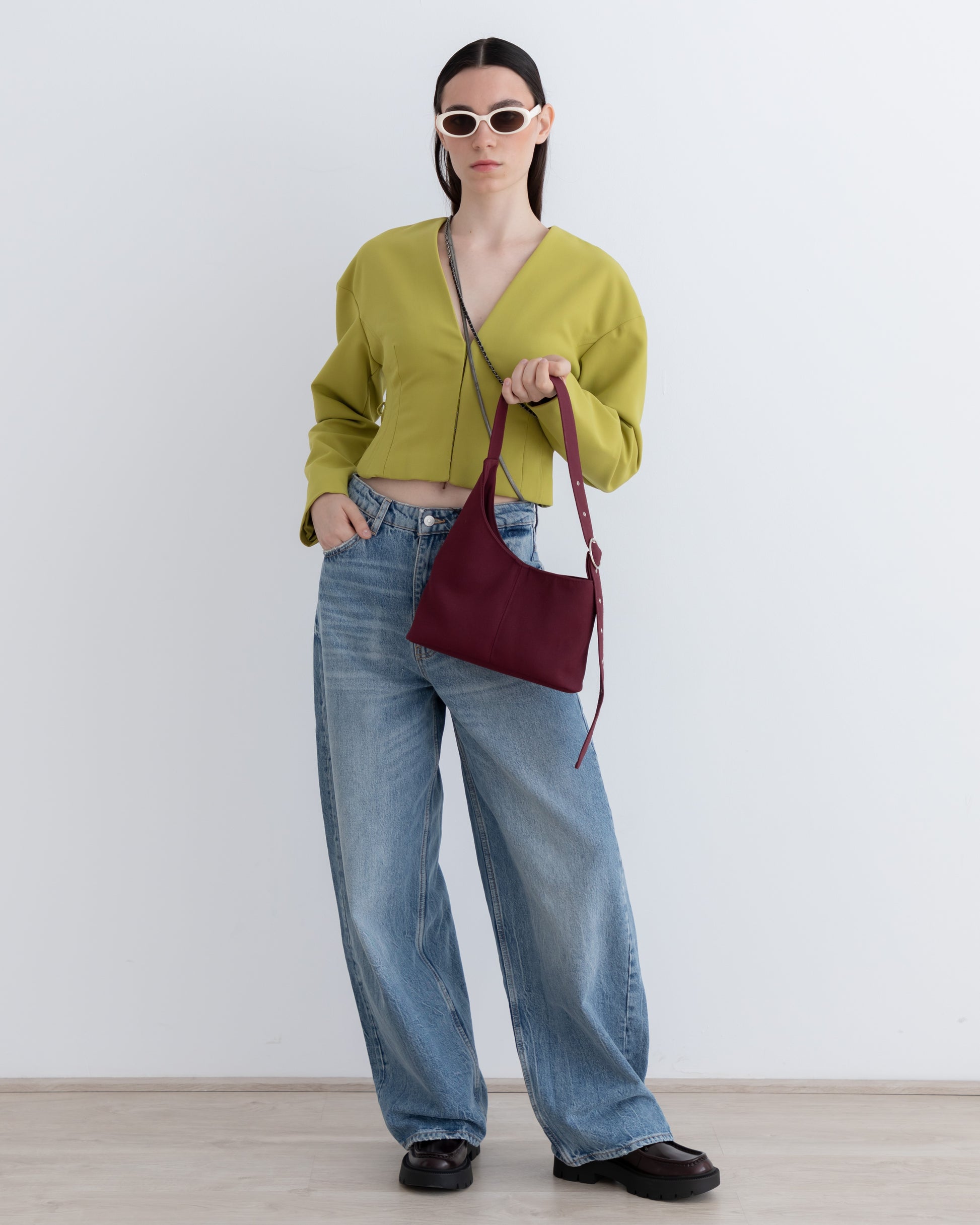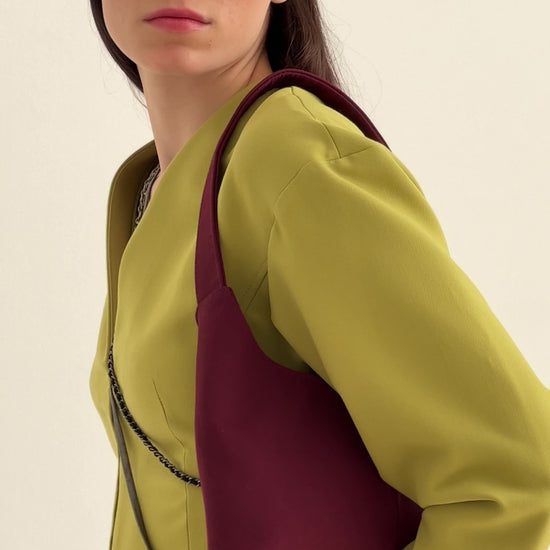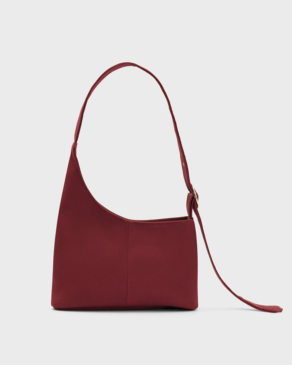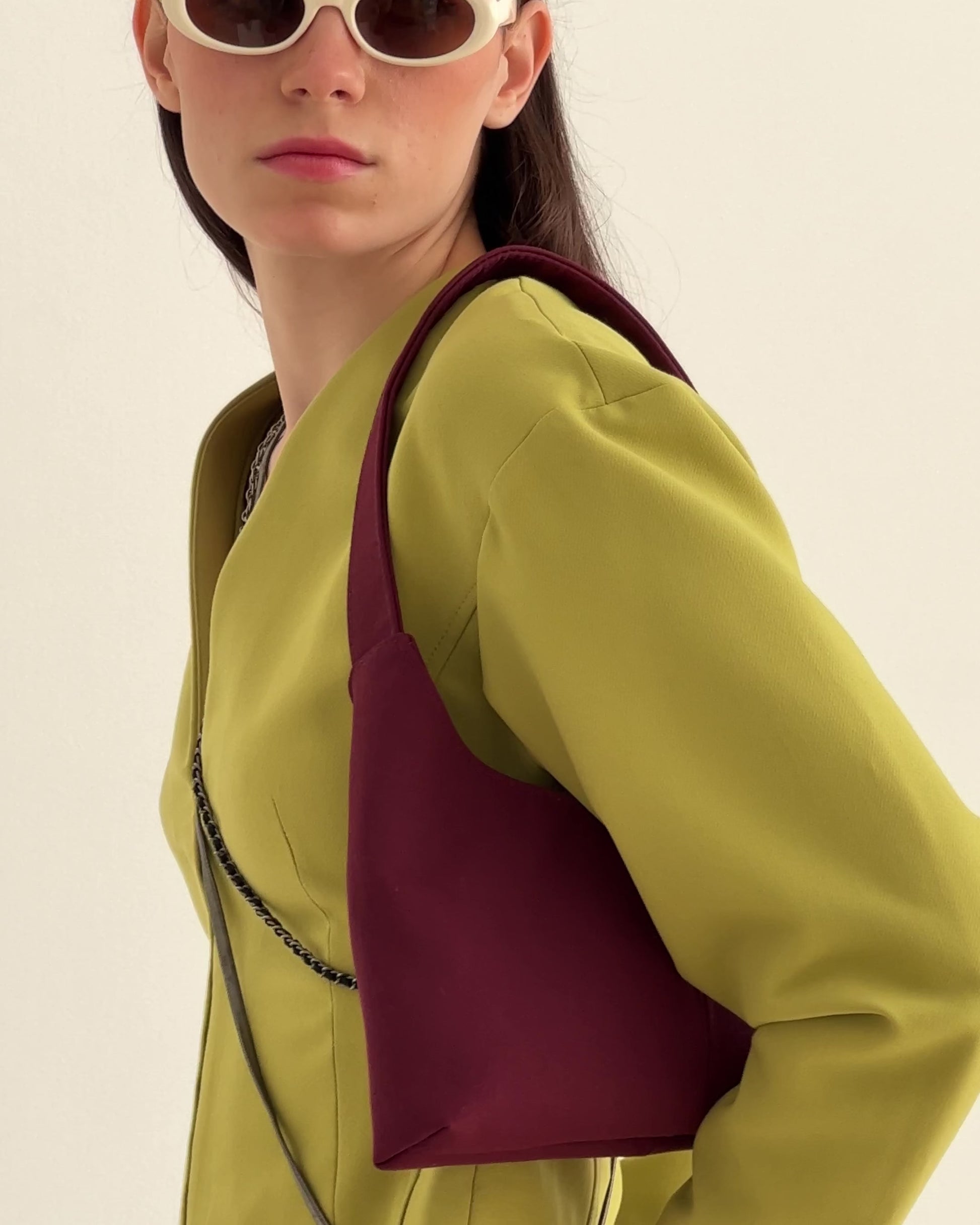 Simona es un bolso asimétrico de base ovalada, diseñado para cualquier ocasión, ya sea de día o de noche. Su forma es única, con una estética minimalista.